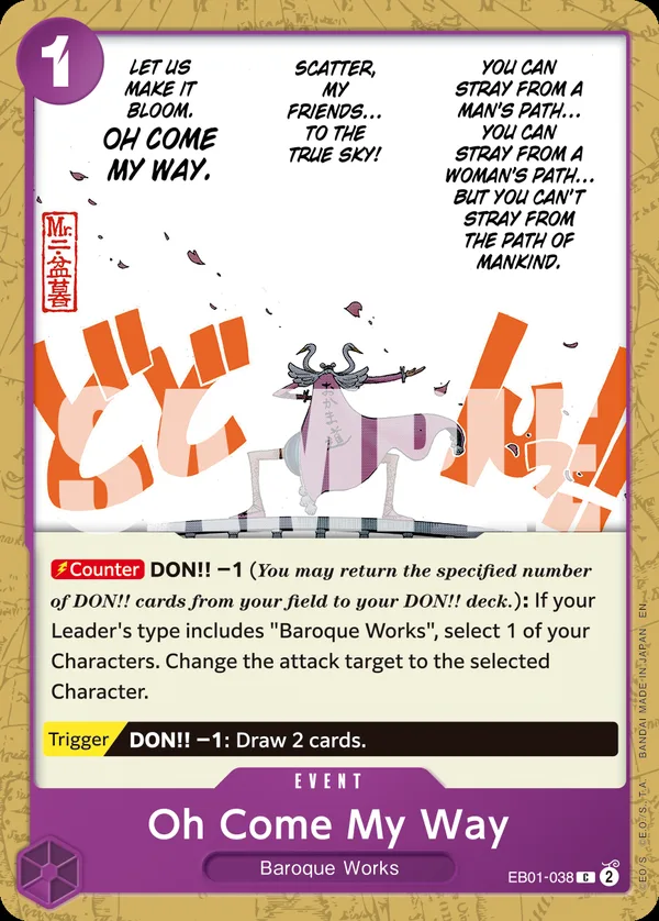 DON!! −1 (You may return the specified number of DON!! cards from your field to your DON!! deck.): If your Leader's type includes "Baroque Works", select 1 of your Characters. Change the attack target to the selected Character.