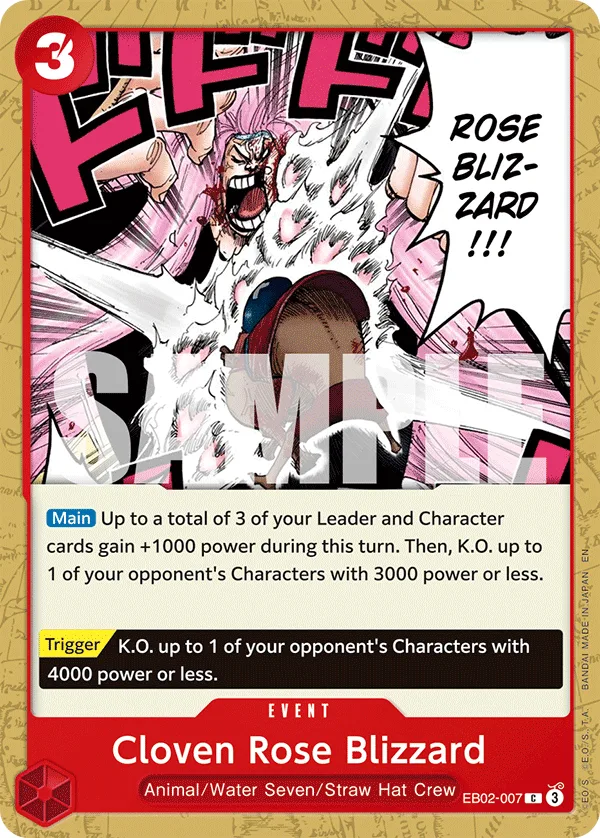 Up to a total of 3 of your Leader and Character cards gain +1000 power during this turn. Then, K.O. up to 1 of your opponent's Characters with 3000 power or less.