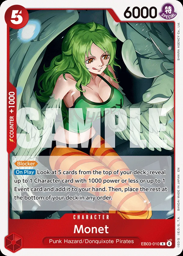 Look at 5 cards from the top of your deck; reveal up to 1 Character card with 1000 power or less or up to 1 Event card and add it to your hand. Then, place the rest at the bottom of your deck in any order.