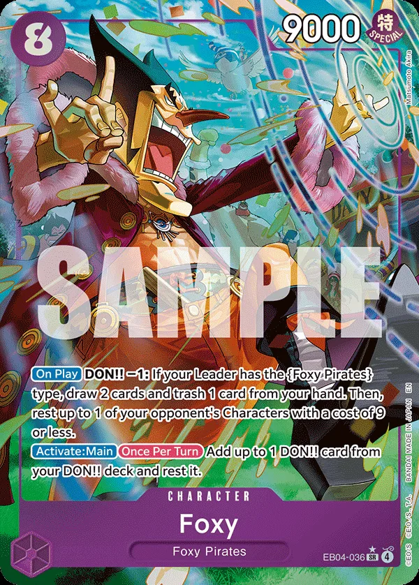 DON!! −1: If your Leader has the Foxy Pirates type, draw 2 cards and trash 1 card from your hand. Then, rest up to 1 of your opponent's Characters with a cost of 9 or less.