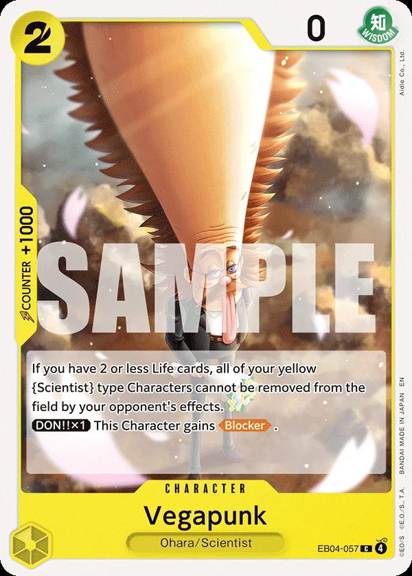 If you have 2 or less Life cards, all of your yellow Scientist type Characters cannot be removed from the field by your opponent's effects.DON!! x1 This Character gains Blocker.