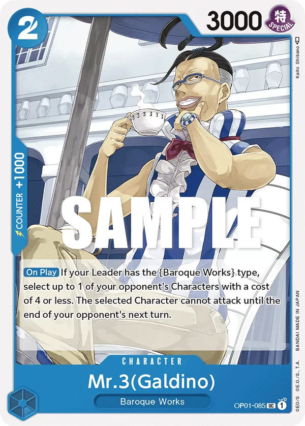 If your Leader has the Baroque Works type, select up to 1 of your opponent's Characters with a cost of 4 or less. The selected Character cannot attack until the end of your opponent's next turn.