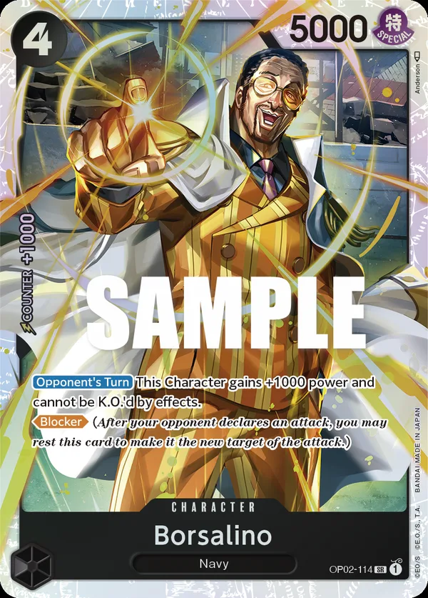 This Character gains +1000 power and cannot be K.O.'d by effects.Blocker (After your opponent declares an attack, you may rest this card to make it the new target of the attack.)