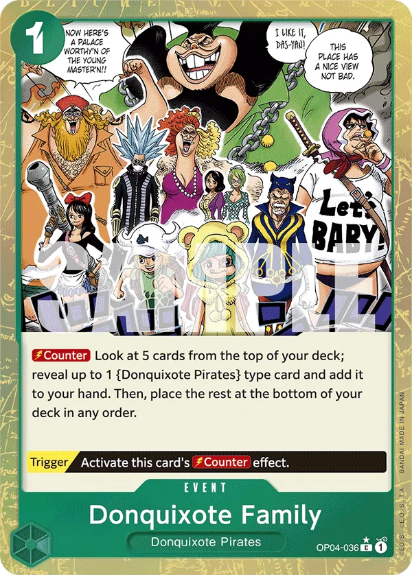Look at 5 cards from the top of your deck; reveal up to 1 Donquixote Pirates type card and add it to your hand. Then, place the rest at the bottom of your deck in any order.
