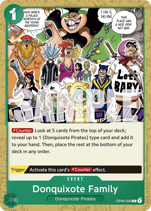 Look at 5 cards from the top of your deck; reveal up to 1 Donquixote Pirates type card and add it to your hand. Then, place the rest at the bottom of your deck in any order.