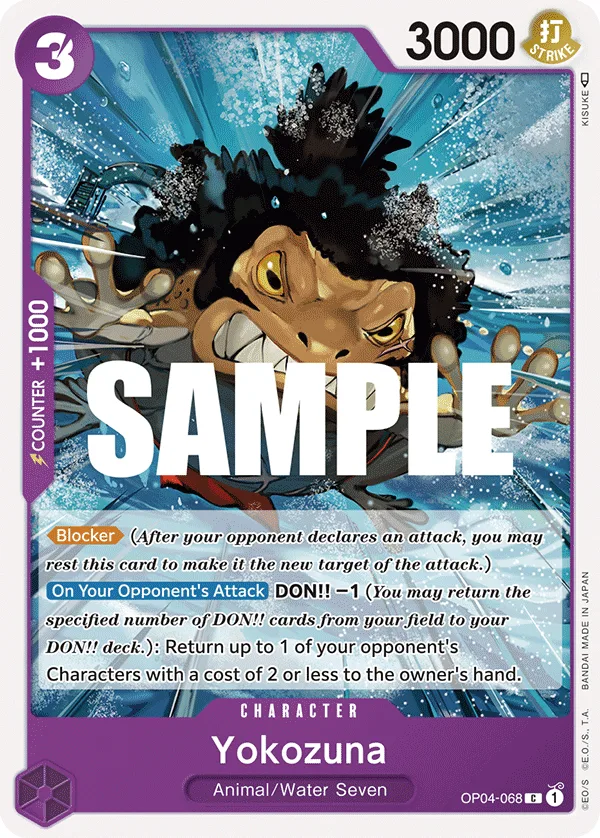 Blocker (After your opponent declares an attack, you may rest this card to make it the new target of the attack.)On Your Opponent's Attack DON!! −1 (You may return the specified number of DON!! cards from your field to your DON!! deck.): Return up to 1 of your opponent's Characters with a cost of 2 or less to the owner's hand.