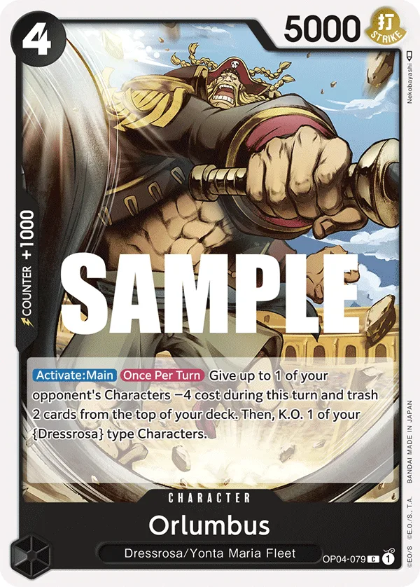 Give up to 1 of your opponent's Characters −4 cost during this turn and trash 2 cards from the top of your deck. Then, K.O. 1 of your Dressrosa type Characters.