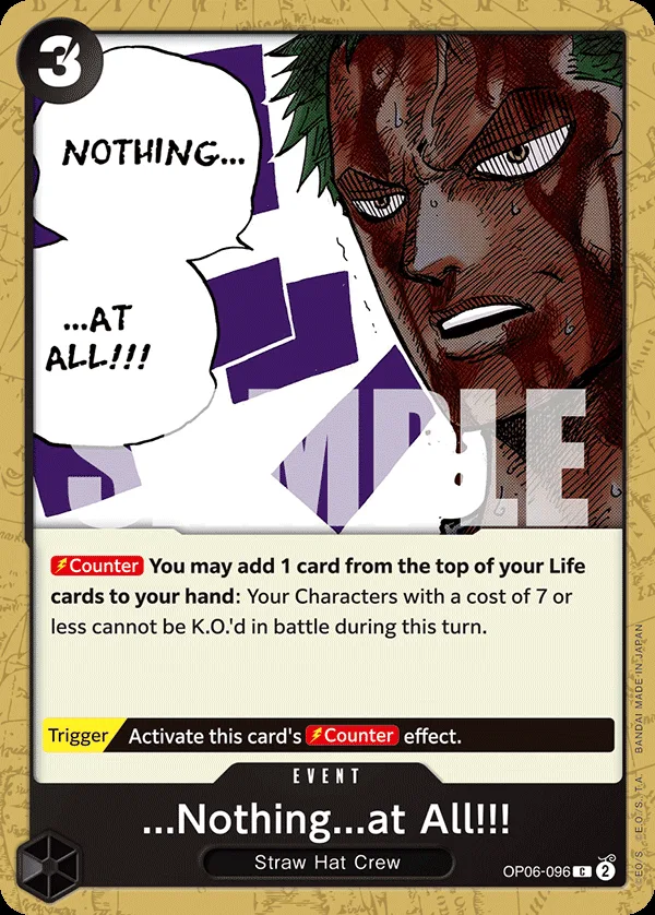 You may add 1 card from the top of your Life cards to your hand: Your Characters with a cost of 7 or less cannot be K.O.'d in battle during this turn.