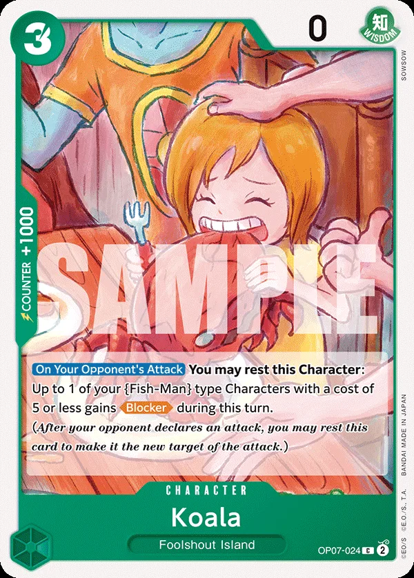 On Your Opponent's Attack You may rest this Character: Up to 1 of your Fish-Man type Characters with a cost of 5 or less gains Blocker during this turn.(After your opponent declares an attack, you may rest this card to make it the new target of the attack.)