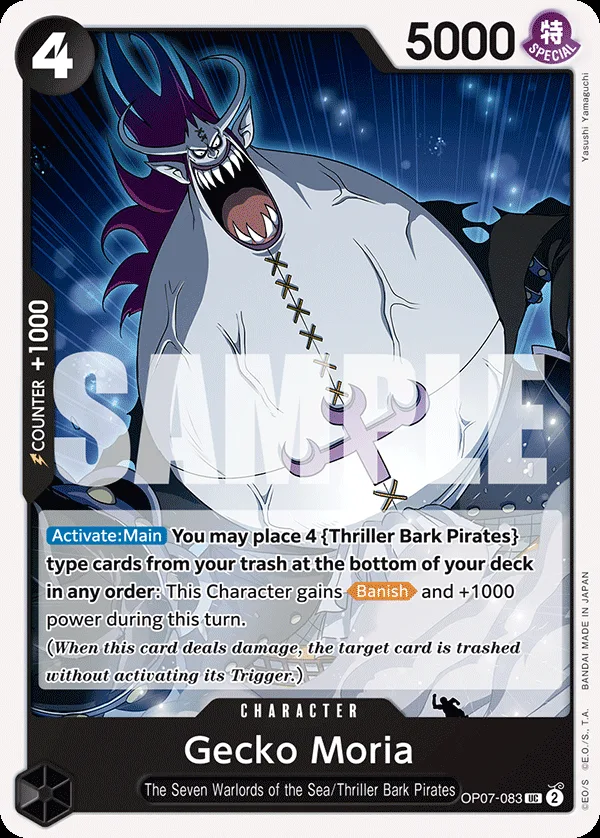 You may place 4 Thriller Bark Pirates type cards from your trash at the bottom of your deck in any order: This Character gains Banish and +1000 power during this turn.(When this card deals damage, the target card is trashed without activating its Trigger.)
