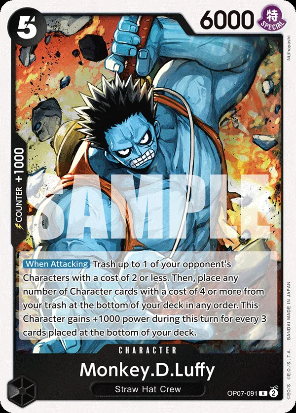 Trash up to 1 of your opponent's Characters with a cost of 2 or less. Then, place any number of Character cards with a cost of 4 or more from your trash at the bottom of your deck in any order. This Character gains +1000 power during this turn for every 3 cards placed at the bottom of your deck.
