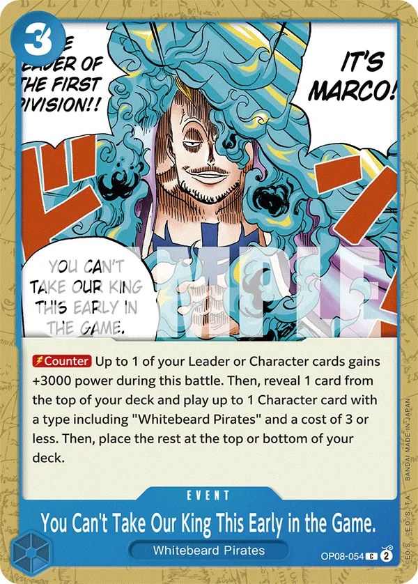 Up to 1 of your Leader or Character cards gains +3000 power during this battle. Then, reveal 1 card from the top of your deck and play up to 1 Character card with a type including "Whitebeard Pirates" and a cost of 3 or less. Then, place the rest at the top or bottom of your deck.