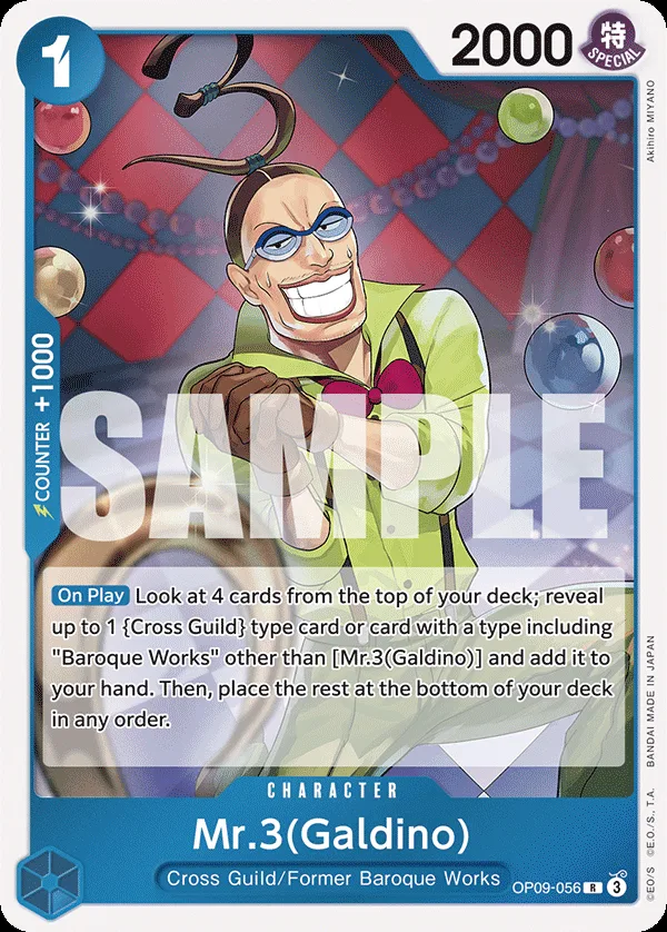 Look at 4 cards from the top of your deck; reveal up to 1 Cross Guild type card or card with a type including "Baroque Works" other than Mr.3(Galdino) and add it to your hand. Then, place the rest at the bottom of your deck in any order.