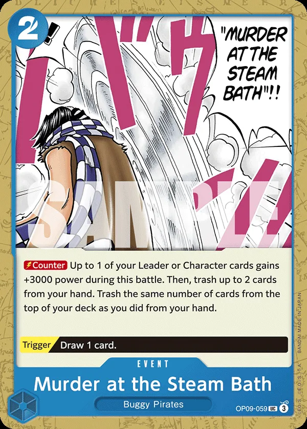 Up to 1 of your Leader or Character cards gains +3000 power during this battle. Then, trash up to 2 cards from your hand. Trash the same number of cards from the top of your deck as you did from your hand.