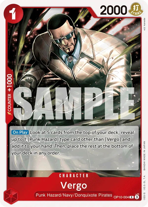 Look at 5 cards from the top of your deck; reveal up to 1 Punk Hazard type card other than Vergo and add it to your hand. Then, place the rest at the bottom of your deck in any order.