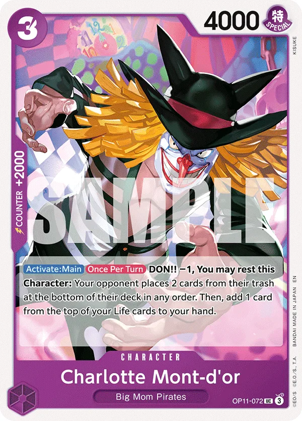 DON!! −1, You may rest this Character: Your opponent places 2 cards from their trash at the bottom of their deck in any order. Then, add 1 card from the top of your Life cards to your hand.