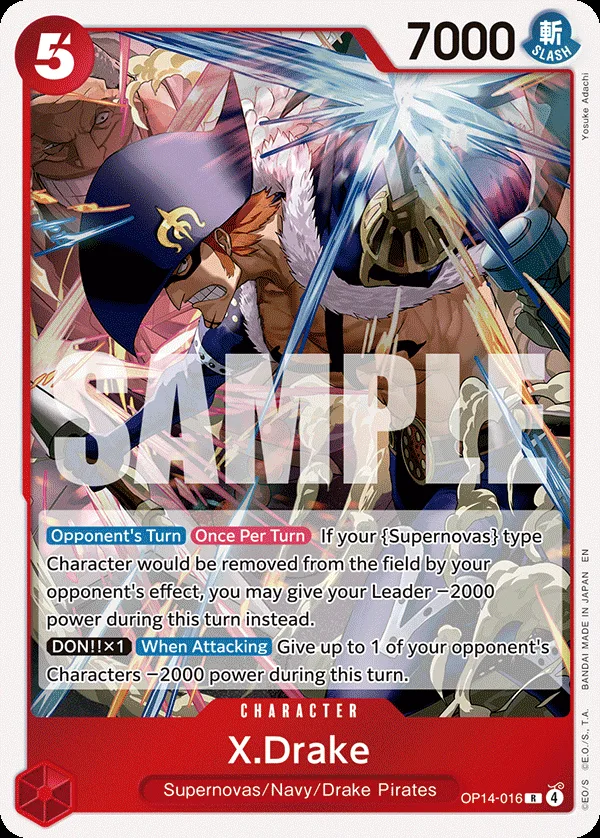 If your Supernovas type Character would be removed from the field by your opponent's effect, you may give your Leader −2000 power during this turn instead.DON!! x1