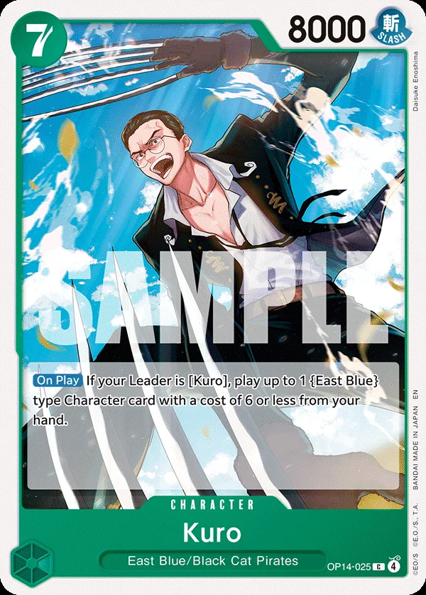 If your Leader is Kuro, play up to 1 East Blue type Character card with a cost of 6 or less from your hand.