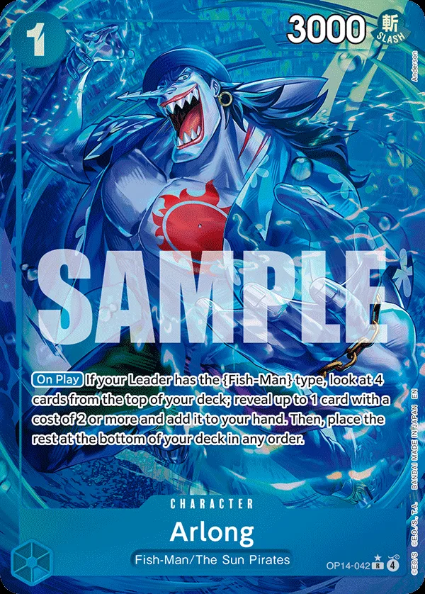 If your Leader has the Fish-Man type, look at 4 cards from the top of your deck; reveal up to 1 card with a cost of 2 or more and add it to your hand. Then, place the rest at the bottom of your deck in any order.