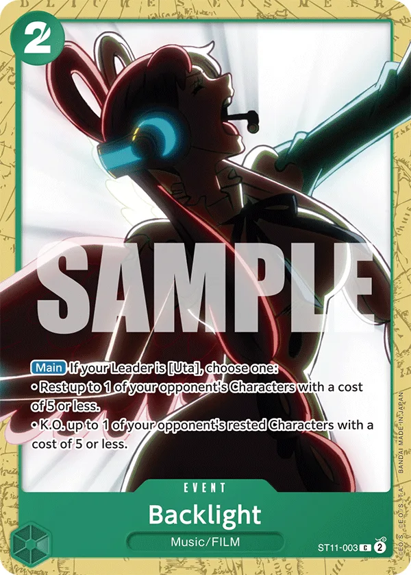 If your Leader is Uta, choose one:• Rest up to 1 of your opponent's Characters with a cost of 5 or less.• K.O. up to 1 of your opponent's rested Characters with a cost of 5 or less.